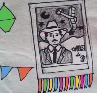 A oficina de Bandeirolas-estandartes em tecido usará técnicas mistas de gravura com estética de cordel, abordando de forma lúdica a questão narrativa na composição das cenas. As peças /carimbos serão produzidas em E.V.A. e cortiça antes da oficina, pois o foco é alcançar mais pessoas, e brincar com a composição e impressão de diversos estandartes, que enfeitarão a rua da Paim durante o Arraiá.